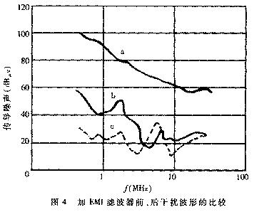 ЕМИ filter efikasno mogu da suzbijem elektromagnetske smetnje od jedne čip Prebacujem napajanje strujom. Slika 4. Oblina 0,15 MHz ~ 30MHz provodljivost buku u prebacivanju napajanje (ЕМИ), koja je u krivu o je u prebacivanja izvorom napajanja (odnosno vrhunac kovertu od elektromagnetske smetnje). Kriva B je umetnut kao što je prikazano u talasnom obliku slika 3 (d) ЕМИ filtera, elektromagnetske smetnje mogu biti diplomca 50dB V ~ 70dB V. očigledno, efekat ovaj položaj filter je bolje.